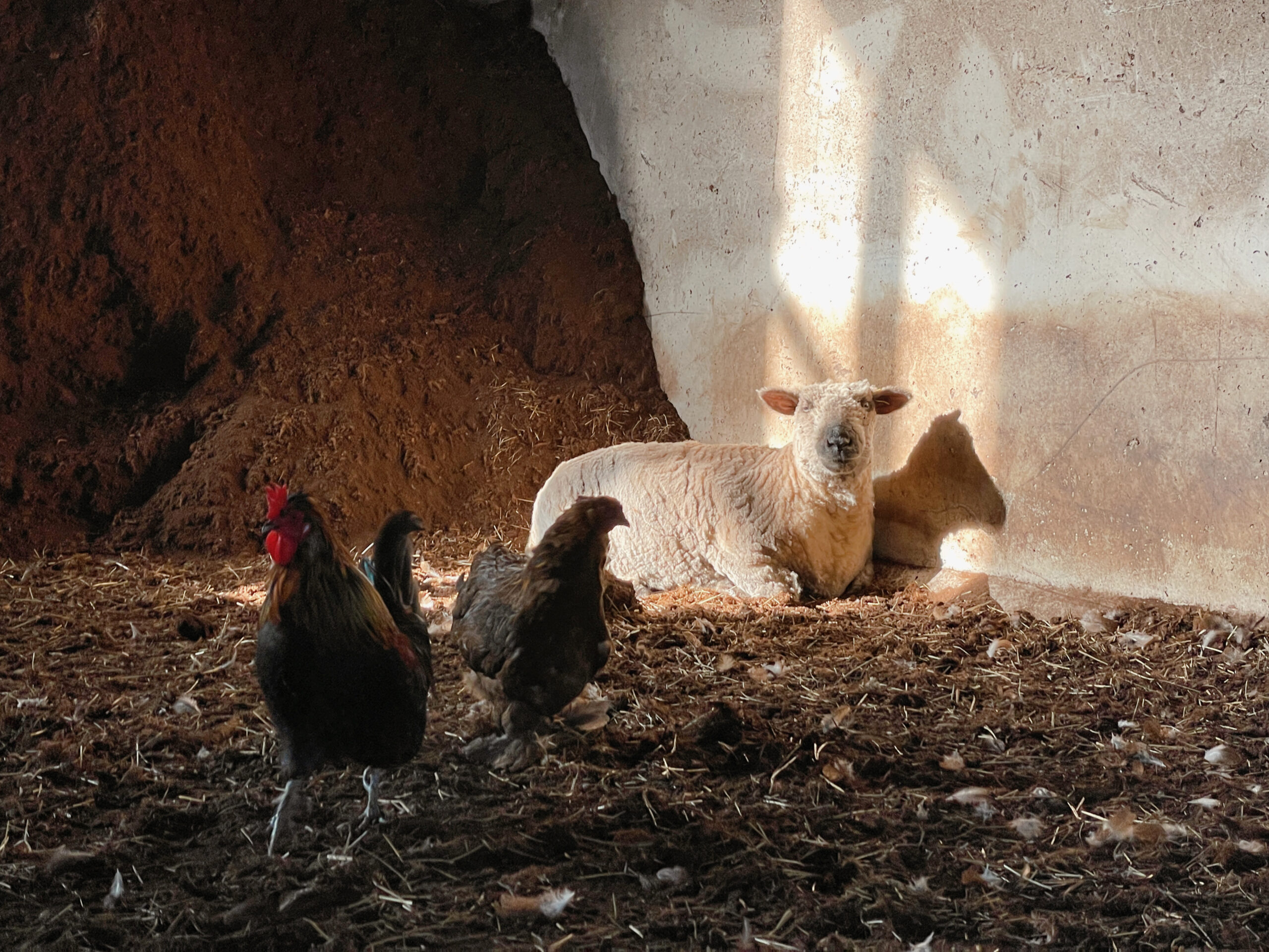 Tilan pihapiiriä niittävät Oxford down -lampaat Mami ja Fafi ja seuraa pitävät myös kanat ja Kukkonen. Tallipupukin odottaa rapsutuksia!