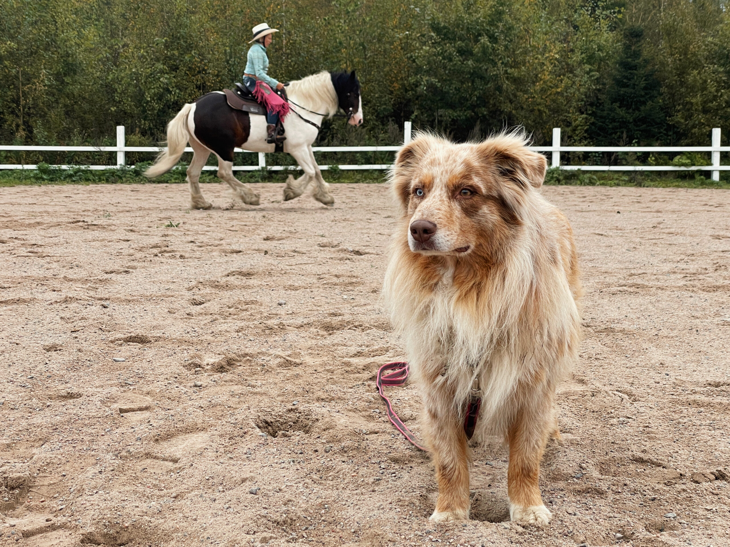 Saatat nähdä myös australianpaimenkoirat Redi ja pentunsa Dalton. Redi tykkää kaikista ja harrastaa pallon kuljetusta lähes päivittäin. Dalton on perinyt isältänsä loputtoman rapsutuskaipuun.